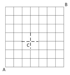 streets, the key is to recognize that all such paths include point C (the