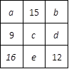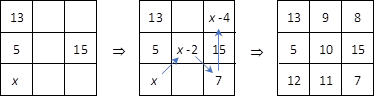 The number at the center of the square must be the average of the 9 numbers. Each row, column, or diagonal adds up to 3 times the average. The number at the corner of the square is the average of the two numbers that are not in the same row, column, or diagonal of that number.