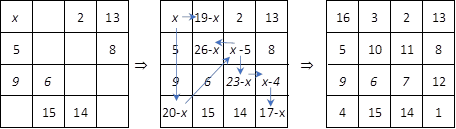 same row, column, or diagonal, all numbers in the square can be determined. Figure 2‑4 shows how to calculate the remaining numbers. Since the sum of the