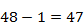 one. What is the total number of breaks needed to break the chocolate bar into 48 small squares?Solution: The problem may look like a complex one. There are so many ways to break the chocolate bar, and each piece can be further broken in many ways. What is the key to solving this problem? Instead of focusing on different possible ways to break a bar at each step, each break shares the same property: the number of pieces always increases by 1 with each break since it always breaks one piece into two. In the beginning, we have a single piece. In the end, we will have 48 pieces. Therefore, the number of breaks must be